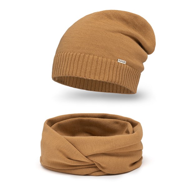 Camelowy komplet zimowy wykonany w 100% z akrylu. Czapka o przedłużonym fasonie (smerfetka) idealnie dopasowuje się do głowy, zapewniając ciepło i komfort w chłodniejsze dni. Komin, owijany na dwa razy, otuli szyję, chroniąc przed zimnym wiatrem. Ten zestaw to idealne rozwiązanie na jesienne wieczory oraz mroźniejsze dni zimy, oferując uniwersalny styl i wyjątkową jakość.