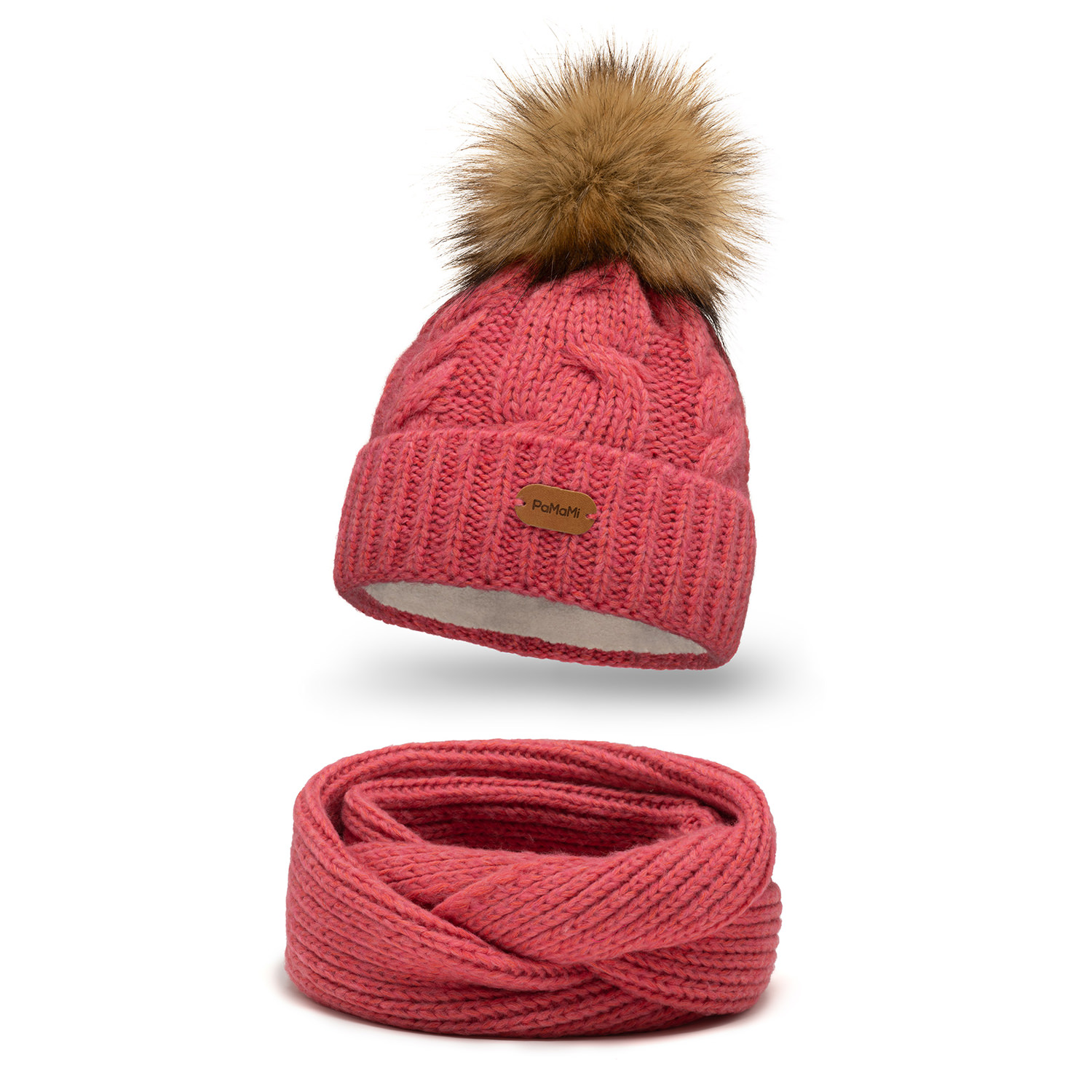 Różowy komplet damski na zimowe dni składający się z klasycznej czapki z wywinięciem i futerkowym pomponem oraz komina do owinięcia na dwa razy. Czapka jest podszyta miękkim polarem, zapewniając dodatkowe ciepło i komfort. Idealny wybór na zimowe spacery, kiedy chcesz wyglądać elegancko i czuć się przytulnie. Komplet wykonany z mieszanki - 51% wełna jagnięca, 49% bawełna.
