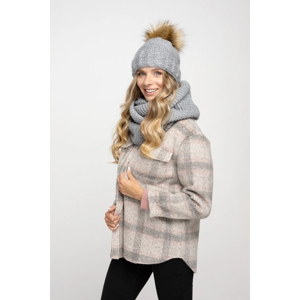 Szary komplet damski, idealny na siarczyste mrozy. Zestaw składa się z klasycznej czapki z pomponem i komina na dwa razy. Czapka jest ocieplona miękkim polarem na 3/4 wysokości, co zapewnia ciepło i komfort. Wykonany z mieszanki 51% wełny jagnięcej, 49% bawełny, komplet jest delikatny w dotyku, a jednocześnie trwały. Pompon z futerka dodaje uroku, a kolor sprawia, że zestaw pasuje do wielu zimowych stylizacji. Komin do owinięcia na dwa razy przyjemnie otula szyję.